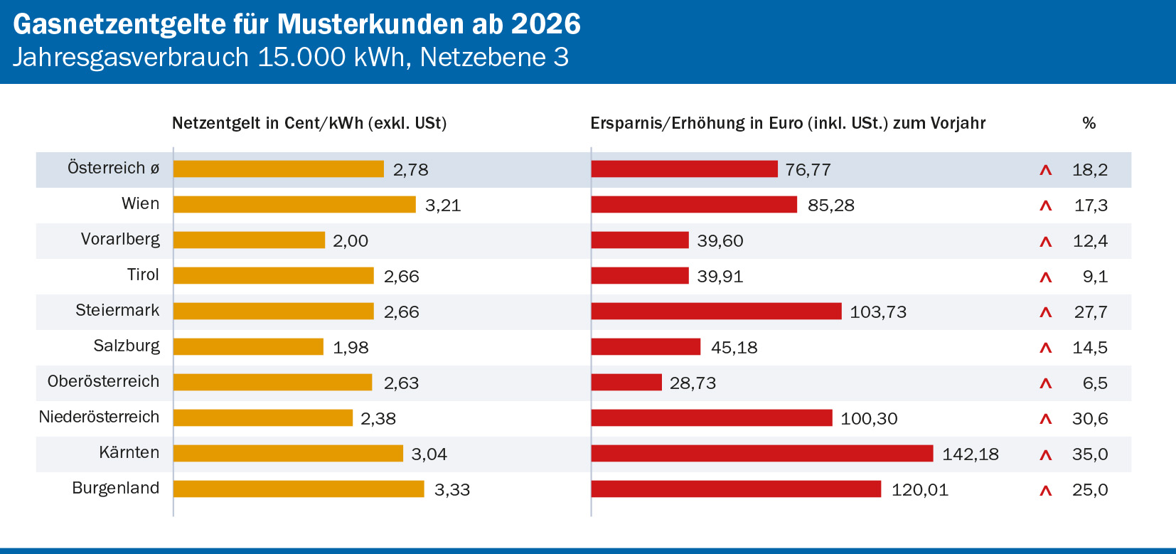 „In den Bundesländern Steiermark, Kärnten, Burgenland und Niederösterreich steigen die Gasnetzentgelte überdurchschnittlich an. Hier haben Mengenrückgänge und höhere vorgelagerte Netzkosten zu Kostensteigerungen geführt. Die Erhöhungen sind je nach Bundesland unterschiedlich, dies hat mit den individuellen Mengenentwicklungen in den Bundesländern zu tun.“, erläutert der Vorstand der E-Control, Wolfgang Urbantschitsch.
