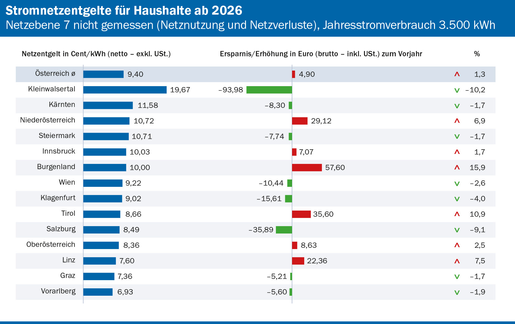 Und er führt dazu weiter aus: „Diese Rahmenbedingungen führen dazu, dass es in einigen Netzbereichen zwar zu moderaten Anstiegen bei den Netznutzungsentgelten kommt, in anderen wiederum die Netzentgelte sinken werden. Die stärksten Anstiege verzeichnen die Netzbereiche Burgenland und Tirol. Hintergrund hier waren vor allem zusätzliche Investitionen. In den Netzbereichen Kärnten, Vorarlberg, Klagenfurt, Steiermark, Graz, Wien und Vorarlberg kommt es zu leichten Senkungen. In den Bereichen Salzburg und Kleinwalsertal gibt es stärkere Reduktionen der Entgelte. Im Netzbereich Kleinwalsertal ist dies auf geringere vorgelagerte Netzkosten aus Deutschland zurückzuführen, während die Entwicklung in Salzburg auf die allgemeine Kosten- und Mengenentwicklung des Landesnetzbetreibers zurückzuführen ist.“