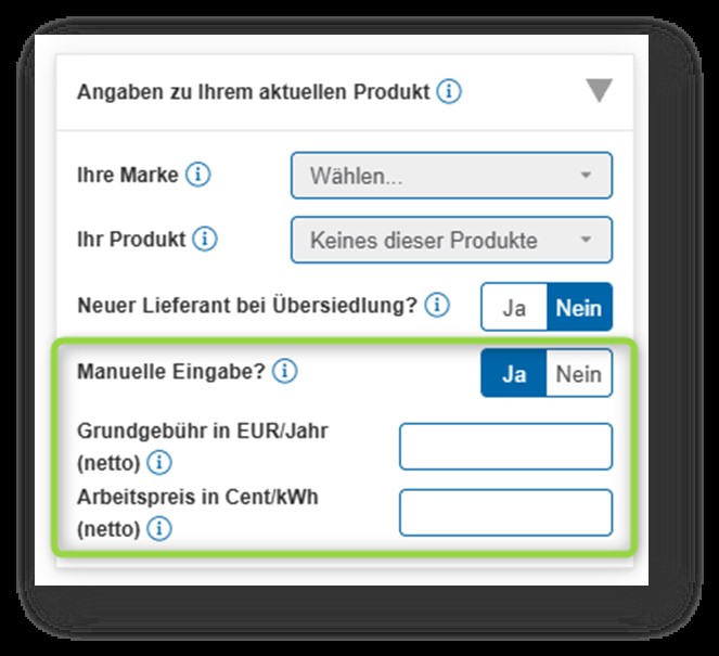 Findet sich Ihr Anbieter oder Ihr Produkt nicht in der Auflistung, hat der Lieferant keine Daten zur Verfügung gestellt oder das Produkt ist nicht mehr im Angebot. Wenden Sie sich bitte direkt an den jeweiligen Lieferanten. Abfragen mit Preisvergleich können im Tarifkalkulator auch ohne die Auswahl eines Produkts vorgenommen werden, indem man selbst den Arbeitspreis und das Grundentgelt des eigenen, aktuellen Produkts eingibt.