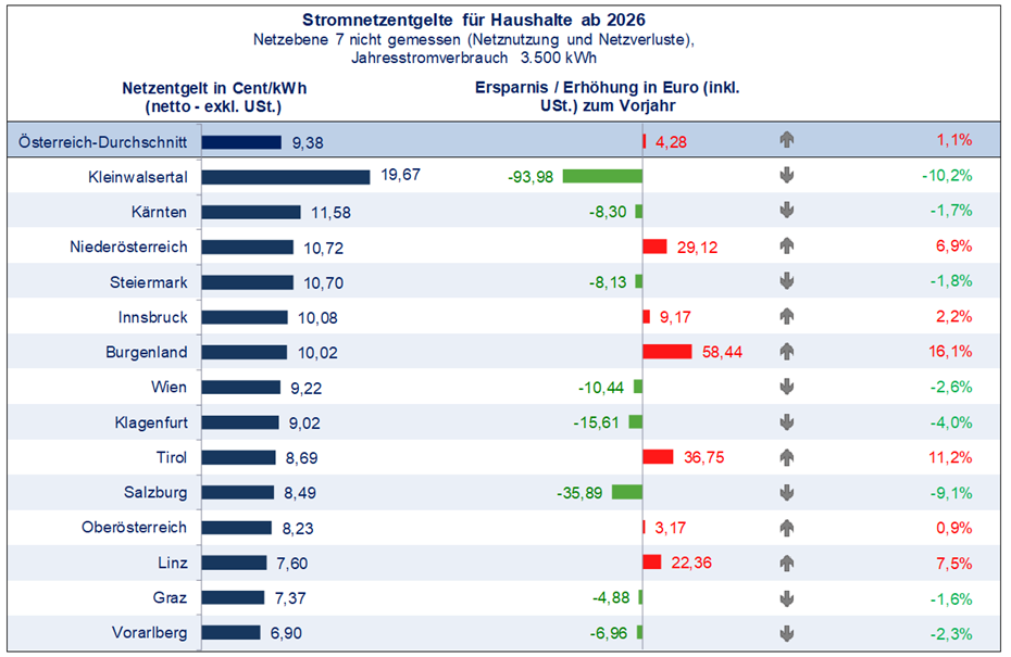 Die Strom-Netzentgelte werden laut Begutachtungsentwurf der zugehörigen Verordnung mit 1. Jänner 2026 im Österreichschnitt marginal steigen, nämlich um rund 1%. Die Gründe für diese Erhöhung sind vielfältig. Es steigen zwar die Kosten für die Netzbetreiber durch Investitionen in den Netzausbau (insbesondere, um erneuerbare Energien anzubinden) sowie die Kosten für den Betrieb oder die Materialbeschaffung in Zusammenhang mit der hohen Inflation der letzten Jahre. Demgegenüber haben sich aber die Verbrauchsmengen nach spürbaren Rückgängen in den letzten Jahren stabilisiert und zusätzliche Erlöse aus der Vergangenheit werden kostensenkend berücksichtigt. Unter dem Strich führt das dazu, dass die Netzentgelte mit Jänner nur marginal steigen, wobei es regionale Unterschiede gibt. In einigen Netzgebieten sinken die Netzentgelte, in einigen steigen sie.