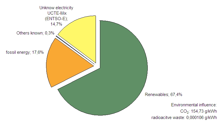 On average, Austrian consumers were supplied with an electricity mix of 67,4 % from known renewable energy sources, 17,6 % from known fossil fuels, 0.3 % from other known energy sources and 14,7 % of unknown origin in 2010 (see figure 2). Electricity of unknown origin is labelled as ENTSO-E (UCTE) mix on the bill.
