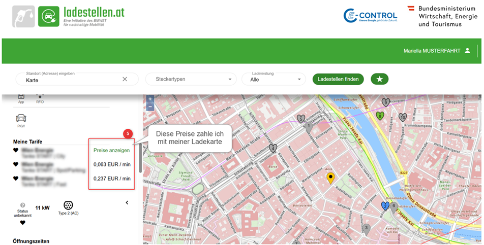 Mit dem neuen Release ist es jetzt möglich, sich einmalig mit einer E-Mail-Adresse anzumelden und dann auf www.ladetarif.at die eigene(n) Ladekarte(n) mit einem Herzsymbol zu markieren. Meldet man sich dann mit denselben Nutzer:innendaten auf www.ladestellen.at an, kann man auf einen Blick zu sehen, welche öffentlich zugängliche Ladestelle mit eben der oder den eigenen Karten (ohne Roamingkosten) funktioniert und zu welchem Preis man dort mit der entsprechenden Ladekarte laden kann. Dabei sehen Nutzer:innen auch sofort, ob im jeweiligen Fall der eigene Ladekartentarif oder evtl. doch der Ad-Hoc-Preis günstiger wäre.